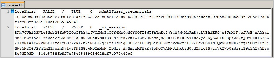- 打开.txt文件并删除除会话cookie外的所有内容,因为您需要这些会话cookie进行身份验证。一个头文件定义凭据,另一个头文件定义会话。保存更新后的文件。