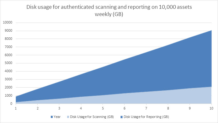 现在我们可以计算随时间变化的总磁盘使用量。在一年的时间里,每周对10,000个资产进行未经身份验证的扫描并生成两个报告所需的总磁盘空间,所有字段的CSV导出和一个顶级补救与细节报告,每星期: